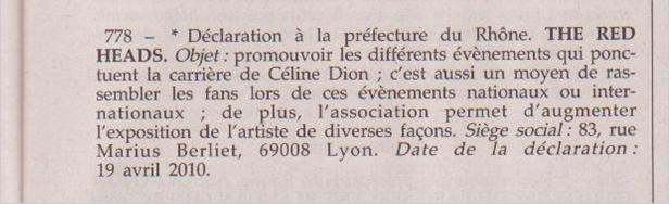 « Declaration made in the Prefecture of Rhône. THE RED HEADS. Object : to promote the different events that punctuate Céline Dion’s career; it is also a way to gather fans in national or international events ; moreover, the non-profit organization increases the artist’s exposure in different ways. Headquarters : Lyon (France). Date of the declaration : April, 19th of April.”
